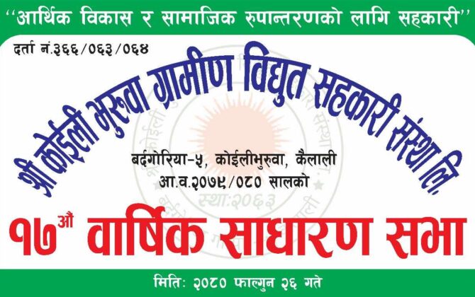 पुरा पढ्नुहोसकैलाली । कैलालीको बर्दगोरिया गाउँपालिका वडा नम्बर ५ मा रहेको कोइली भूरुवा ग्रामिण विद्युत सहकारी संस्था लिमिटेडको को १७ औं वार्षिक साधारण सभा सम्पन्न भएको छ । सहकारी संस्थाले शनिबार आर्थिक वर्ष २०७९/२०८० काे वार्षिक