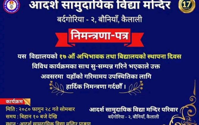पुरा पढ्नुहोसकैलाली। कैलाली जिल्लाको बर्दगोरिया गाउँपालिका वडा नम्बर २ मा रहेको आर्दश सामुदायिक विद्या मन्दिरको १७ औं वार्षिक उत्सब तथा अभिभावक दिवस हुने भएको छ । फागुन २८ गतेका दिन १७ औ वार्षिक उत्सब तथा अभिभावक