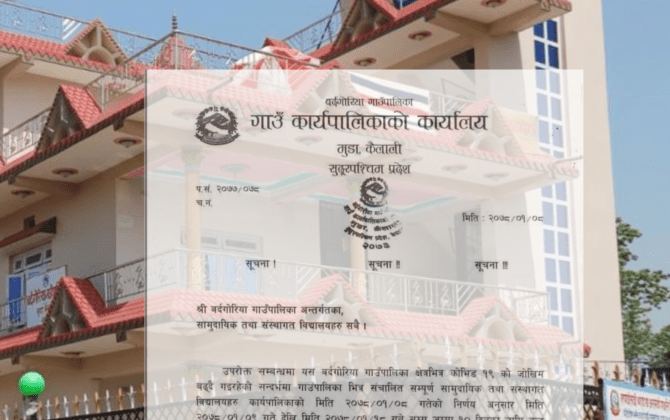 पुरा पढ्नुहोसबौनिया/पछिल्लो समय कोरोना भाइरस संक्रमणको जोखिम बढ्दै गएपछि कैलालीको बर्दगोरिया गाउँपालिका भित्र संचालित सबै विद्यालय १० दिन सम्मका लागि बन्द गरिएको छ । कैलालीको बर्दगोरीया गाउँपालिकाका विद्यालय १० दिनका लागि बन्द भएका छन् । बुधबार