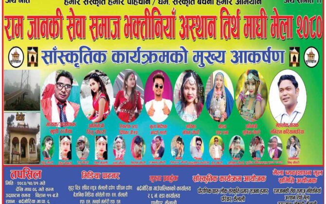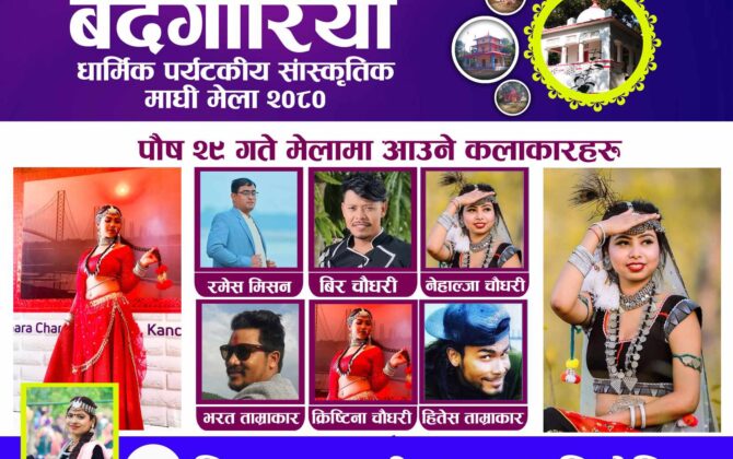 पुरा पढ्नुहोसबर्दगोरिया । कैलालीको बर्दगोरिया गाउँपालिका वडा नम्बर २ मा रहेको धार्मिक तथा पर्यटकीय क्षेत्र बर्दगोरिया धाममा पौष २९ गते आईतवार विभिन्न राष्ट्रिय तथा स्थानिय कलाकारहरुको प्रस्तुति हुने भएको छ । मेलामा पौष २९ गते बिधालय