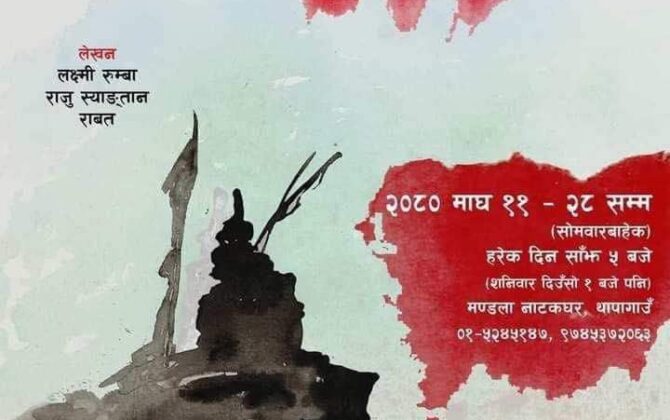 पुरा पढ्नुहोसकाठमाडौँ । थापागाउँस्थित मण्डला थिएटरमा माघ ११ देखि २८ गतेसम्म नाटक ‘मासिन्या’ मञ्चन हुने भएको छ ।नाटकको निर्देशन तथा परिकल्पना बुद्धि तामाङ र सोनाम लामाले गरेका छन् । तामाङ जातिले भोगेको पीडा र संघर्षको