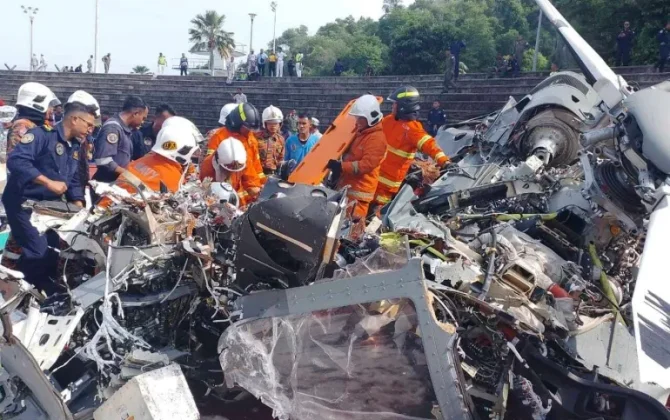 काठमाडौँ । सैनिक अभ्यासका क्रममा मलेसियाली नौसेनाका दुईवटा हेलिकप्टर आपसमा ठोक्किँदा १० जनाको मृत्यु भएको छ ।हेलिकप्टर तल स्टेडियममा खस्नुअघि एक अर्कासँग ठोक्किएको मिडिया रिपोर्टमा उल्लेख गरिएको छ ।यो दुर्घटना मलेसियाको लुमुटमा भएको हो,