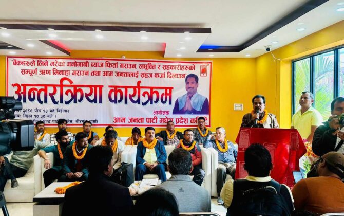वीरगञ्ज । आम जनता पार्टीले बैंकिङ लुट रोक्न भन्दै अन्तरक्रिया कार्यक्रम गरेको छ । वीरगञ्जमा बिहीबार आजपाले बैंकहरुले लिने गरेको मनोमानी ब्याज फिर्ता, लघुवित्त र सहकारीहरुबाट लिएको सम्पूर्ण ऋण मिनाहा तथा किसानहरुलाई सहुलियत कर्जा उपलब्ध