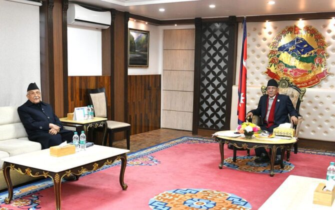 काठमाडौं,  । प्रधानमन्त्री पुष्पकमल दाहाल प्रचण्ड र प्रमुख सत्तासाझेदार एमाले अध्यक्ष केपी शर्मा ओलीबीच राजनीतिक तथा समसामयिक विषयमा छलफल भएको छ । बालुवाटारस्थित प्रधानमन्त्रीको सरकारी निवासमा बिहीबार बिहान पुगेका अध्यक्ष ओली र प्रधानमन्त्रीबीच सत्तारुढ